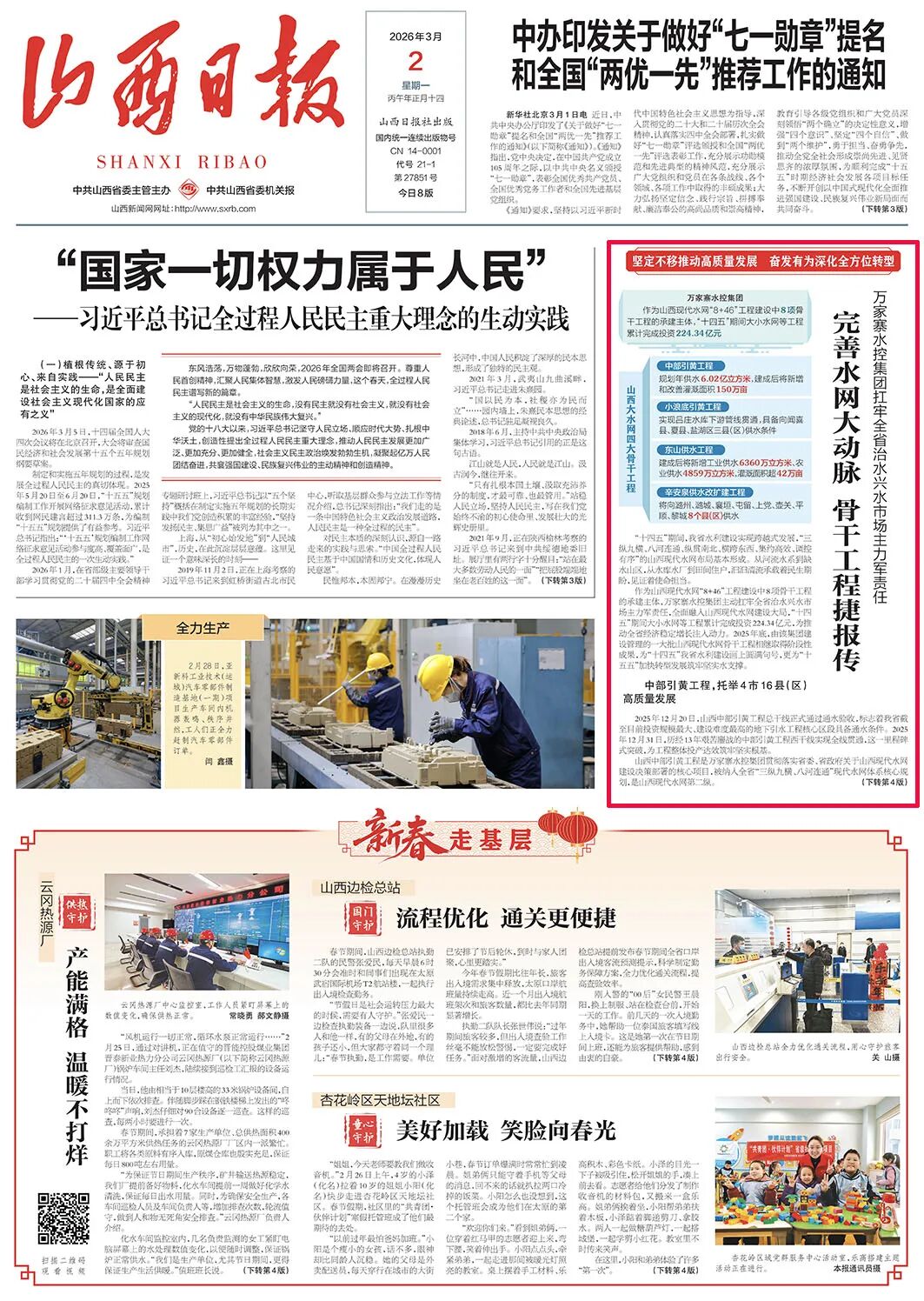 作為山西現(xiàn)代水網(wǎng)“8+46”工程建設(shè)中8項骨干工程的承建主體,萬家寨水控集團主動扛牢全省治水興水市場主力軍責任,全面融入山西現(xiàn)代水網(wǎng)建設(shè)大局,“十四五”期間大小水網(wǎng)等工程累計完成投資224.34億元,為推動全省經(jīng)濟穩(wěn)定增長注入動力。2025年底,由該集團建設(shè)管理的一大批山西現(xiàn)代水網(wǎng)骨干工程相繼取得階段性成果,為“十四五”我省水利建設(shè)畫上圓滿句號,更為“十五五”加快轉(zhuǎn)型發(fā)展筑牢堅實水支撐。