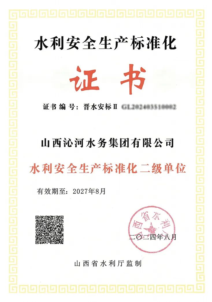 近日,省水利廳向沁河水務(wù)集團頒發(fā)了“水利安全生產(chǎn)標(biāo)準(zhǔn)化二級單位”合格證書和牌匾。