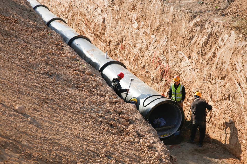 ▲施工15標(biāo)全程55.621公里,目前已開挖30公里,管線鋪設(shè)23公里。圖為東一干邊坡開挖管道安裝