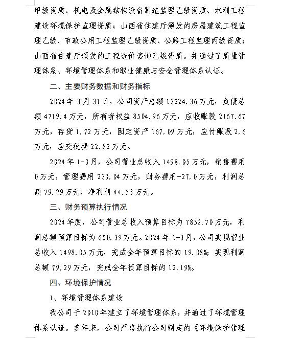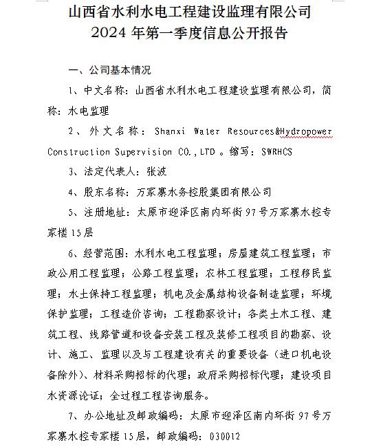 山西萬家寨水控工程投資有限公司2024年第一季度信...