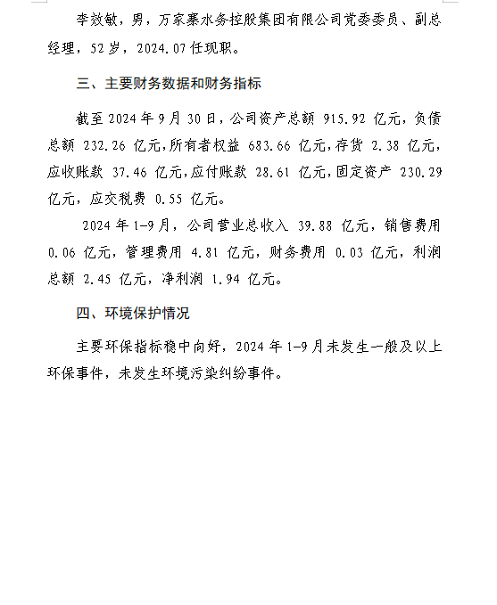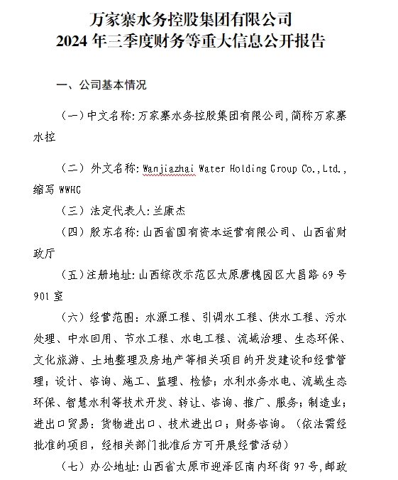 萬家寨水務控股集團有限公司2024年中期財務等重大...