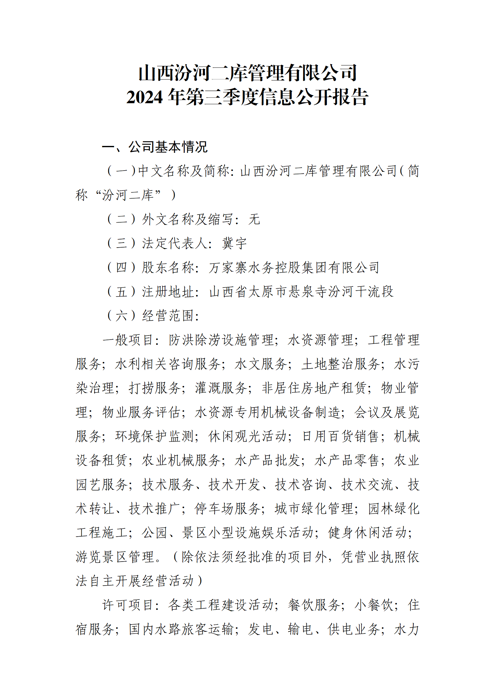 山西汾河二庫管理有限公司2024年中期信息公開報告