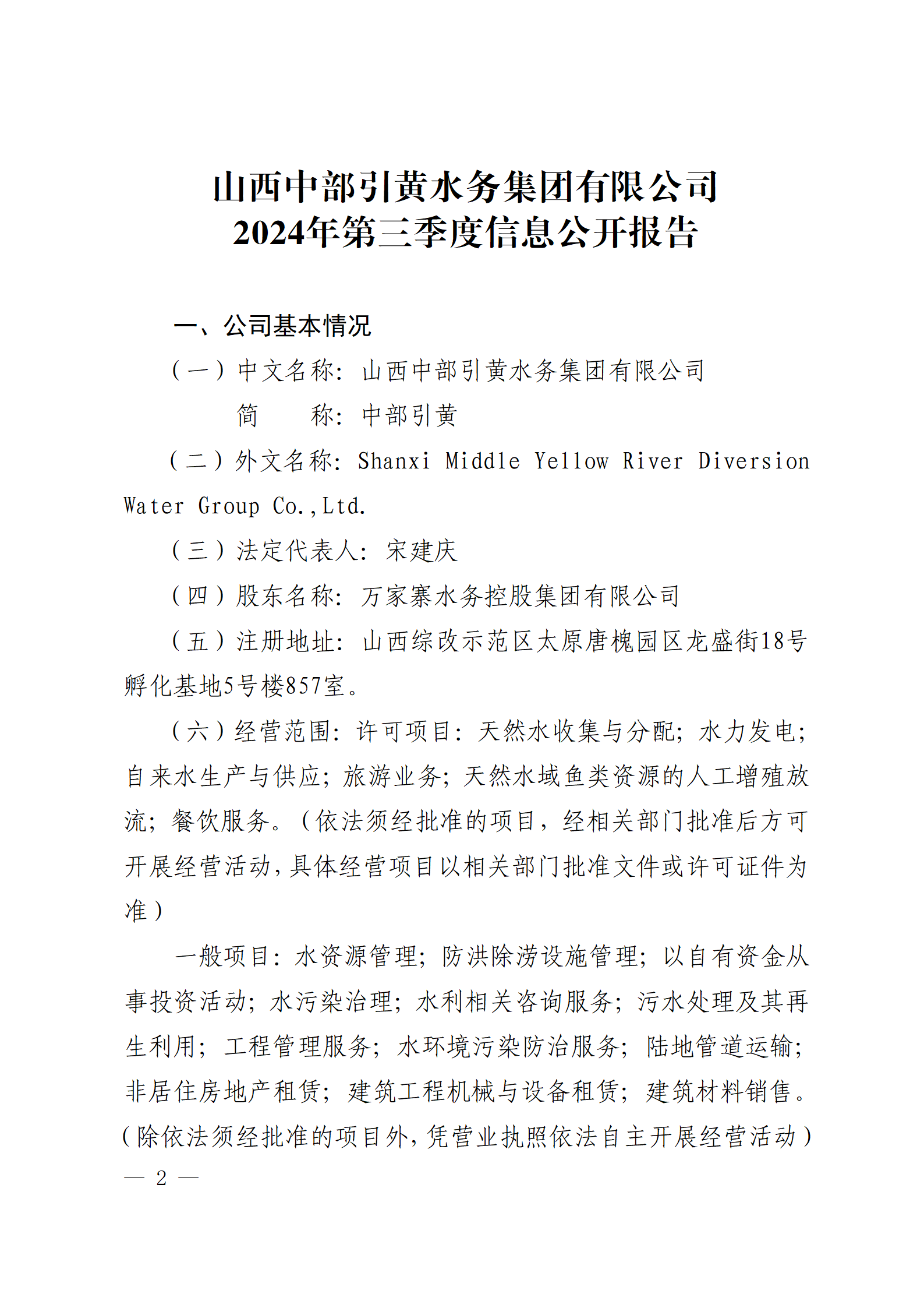 山西太忻滹沱河供水有限公司2024年第三季度重大信...