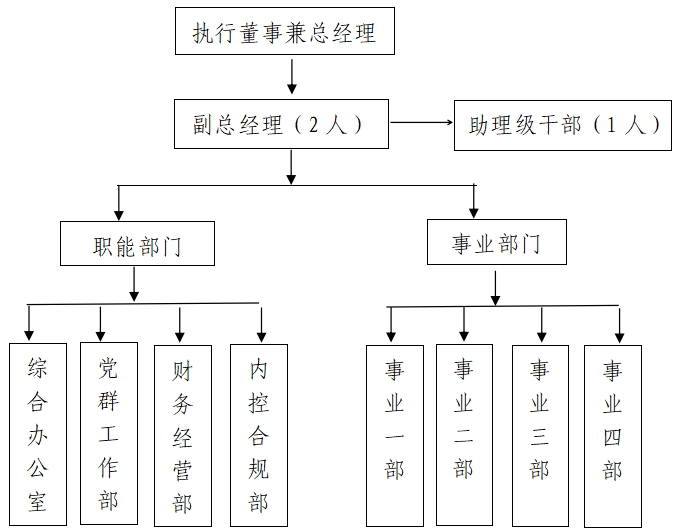 根據(jù)集團(tuán)批復(fù)的“六定”方案,公司批復(fù)企業(yè)負(fù)責(zé)人3人(已配備1正2副),助理級(jí)干部1人(已配備總工程師),中層管理人員8正8副(已配備8正8副),內(nèi)設(shè)職能部門(mén)4個(gè),事業(yè)部門(mén)4個(gè)。