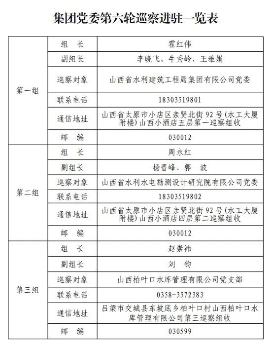 根據(jù)集團(tuán)黨委巡察工作統(tǒng)一部署,3月3日至4日,集團(tuán)第六輪巡察完成進(jìn)駐,三個(gè)巡察組將以“一對(duì)一”形式對(duì)水工局集團(tuán)、設(shè)計(jì)院公司、柏葉口水庫(kù)黨組織開(kāi)展常規(guī)巡察;期間同步開(kāi)展意識(shí)形態(tài)工作責(zé)任制落實(shí)情況和選人用人情況專(zhuān)項(xiàng)檢查。