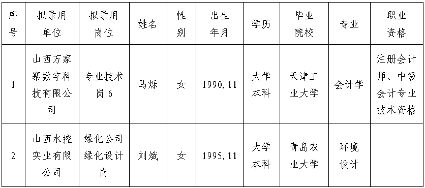 根據(jù)《萬(wàn)家寨水務(wù)控股集團(tuán)有限公司及所屬企業(yè)2024年高層次人才(第一批)招聘公告》和《萬(wàn)家寨水務(wù)控股集團(tuán)有限公司2024年公開(kāi)招聘(第二批)公告》要求,因妊娠期暫緩錄用人員已完成規(guī)定程序,確定馬爍和劉斌2名同志為擬聘人員,現(xiàn)予以公示。公示期間如有問(wèn)題,請(qǐng)向萬(wàn)家寨水控集團(tuán)人才管理服務(wù)中心反映。人員名單如下: